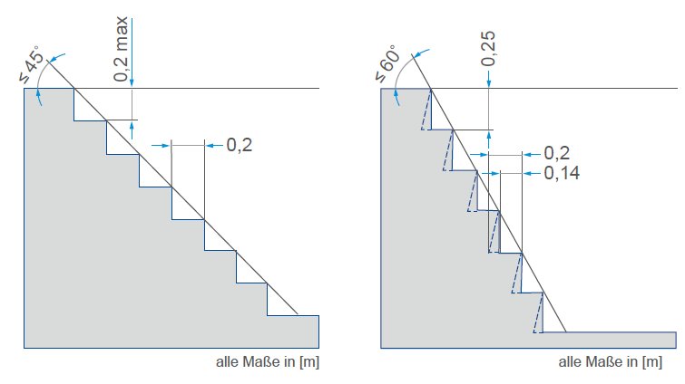 13.5.1 Arbeitsgruben und Unterfluranlagen müssen mit mindestens zwei Treppen ausgestattet sein, deren Neigungswinkel ≤ 45° betragen muss. Bei Arbeitsgruben sollen die Treppen jeweils an den