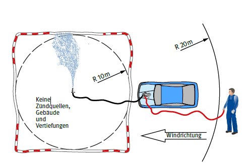 Für das Entspannen von Gassystemen/Gastanks muss eine gekennzeichnete Fläche (Sicherheitsbereich) eingerichtet werden. In diesem Bereich dürfen sich während des Entspannvorgangs keine Fahrzeuge befinden, auch nicht das Fahrzeug, aus dem das Gas abgelassen wird (siehe Abbildung). Andere Arbeiten dürfen während des Abblasens in diesem Bereich nicht ausgeführt werden. Der Sicherheitsbereich ist abzusperren (Flatterband) und an den Zugängen deutlich erkennbar mit der Warnung vor explosionsfähiger Atmosphäre zu kennzeichnen (D-W021 Warnung vor explosionsfähiger Atmosphäre). Das Entspannen bei Gewitter ist grundsätzlich untersagt. Alternativ kann zum Abblasen auch eine durch den Fahrzeughersteller freigegebene Abbrennvorrichtung verwendet werden.