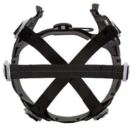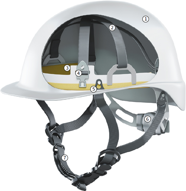1: Helmschale; 2: Stoßdämpfungsbänder (Textil- oder Kunststoffausführung); 3: Kopfband mit Schweißband aus hautfreundlichem Material; 4: Aufhängung für die Stoßdämpfungsbänder; 5: Befestigung für Kinnriemen und Nackenschutz; 6: Tiefliegendes Nackenband mit drehbarer Kopfgrößenanpassung bietet einen guten Sitz des Helms und verbessert den Halt auf dem Kopf; 7: 4-Punkt-Kinnriemen