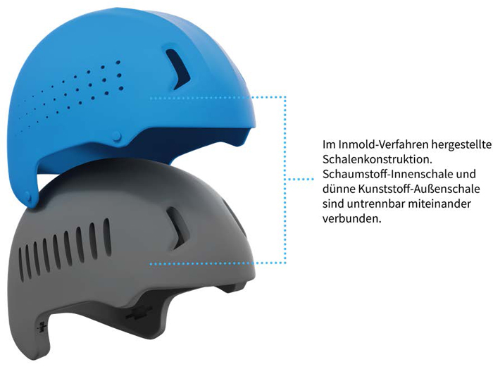 Das In-Mold-Verfahren stellt den Herstellungsprozess dar, bei dem thermoplastische Kunststoffe eingesetzt werden, die in Form von Kunststoffgranulat aus Polyethylen (PE) oder Polypropylen (PP) in eine feste Helmformvorlage aus Metall gegeben werden, in die vorab auch die dünne Helmschale aus Kunststoff eingelegt wird.