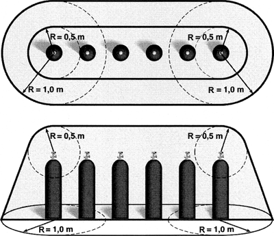 | Hinweis: Eine Mehrflaschenanlage ist eine Anlage, bei der die Gasentnahme aus mehr als einer Flasche gleichzeitig erfolgen kann. Zone für Mehrflaschenanlage mit 2 bis 6 Flaschen siehe obige Abbildungen. | |||||||||||