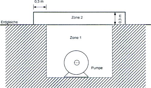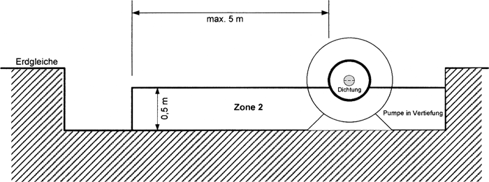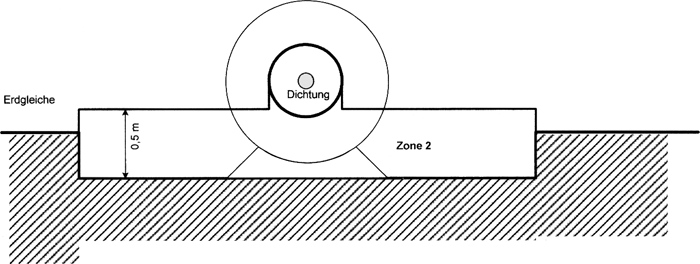 Zone 2: 0,5 m um jede Anschlussstelle und kegelförmig bis zum Boden, am Boden R = 1 m |