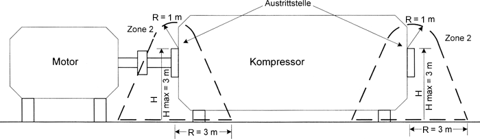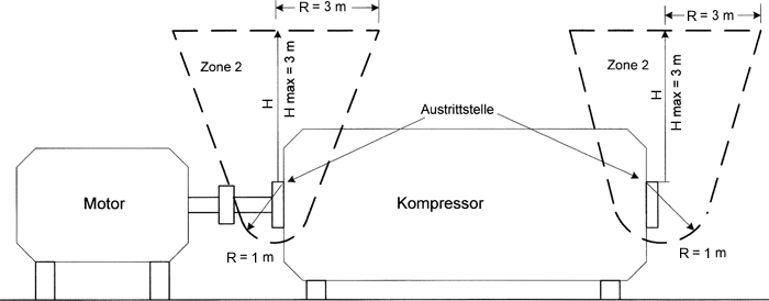 Freisetzung wird automatisch erkannt und g.e.A. wird kurzfristig beseitigt, Zuluft aus explosionsfreiem Bereich. | 2.4.3.3 2.4.4.3 2.5 | Zone 2: im Nahbereich um den Verdichter | keine | ||||||||