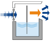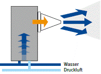 | Prinzip | Wasser wird zum Sieden gebracht und der Wasserdampf mit einem Ventilator in die Raumluft transportiert. | Wasser benetzt eine Verdunstungsfläche, von der ein Ventilator Wasserdampf in die Raumluft transportiert. | Wasser wird zu feinen Tröpfchen vernebelt und in die Raumluft eingeblasen, wo sie mit der Zeit verdunsten. |